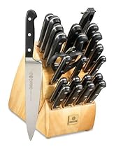 Mundial 5100-24 8-inch carving knife - hollow edge, 8-inch bread knife - serrated edge, 8-inch chef's knife, 10-inch chef's knife, carving fork - straight tines, 10-inch sharpening steel, take-a-part kitchen shears, and 23-slot wood block Fully forged, with a full tang and high-carbon stainless steel blades Long-lasting razor-sharp edge; perfectly-balanced, ergonomic, 3-riveted polyacetal handles ...